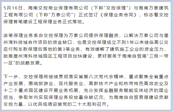 5月16日,海南交控商业保理有限公司(下称“交控保理”)与海南万泰建筑工程有限公司(下称“万泰公司”)正式签订《保理业务合同》,标志着交控保理首笔建设工程保理业务正式落地。 [更多]