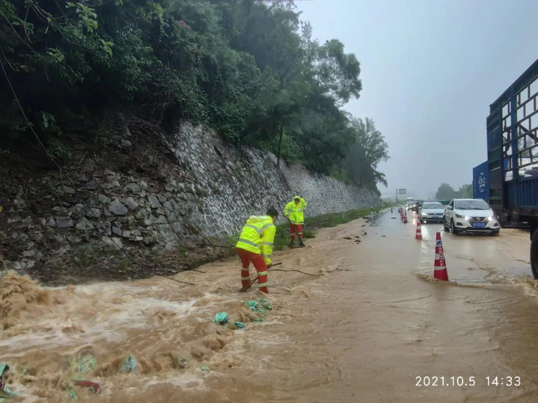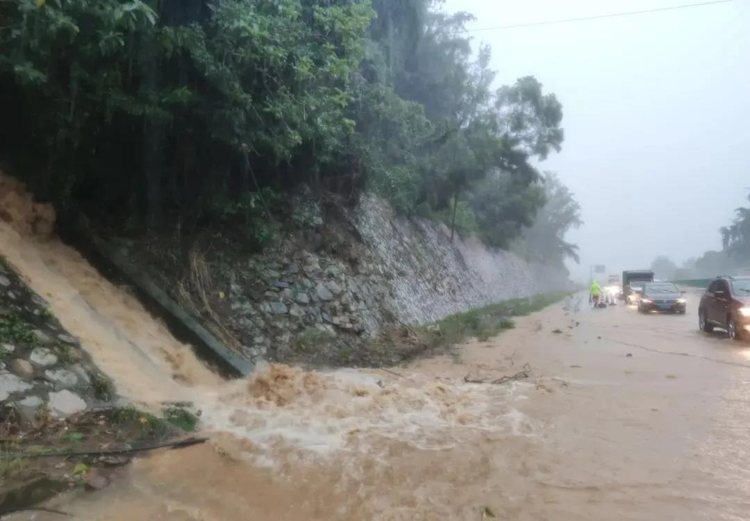 10月5日中午13时,海南交控养护公司万宁管理站员工进行道路巡查时,发现受强降雨影响,G98东线高速左幅三亚往海口方向k160+950处边坡被暴雨冲刷,水流带出大量砂土进入边沟造成淤积拥堵,导致积水涌入高速公路主线行车道,对车辆通行安全造成较大影响。