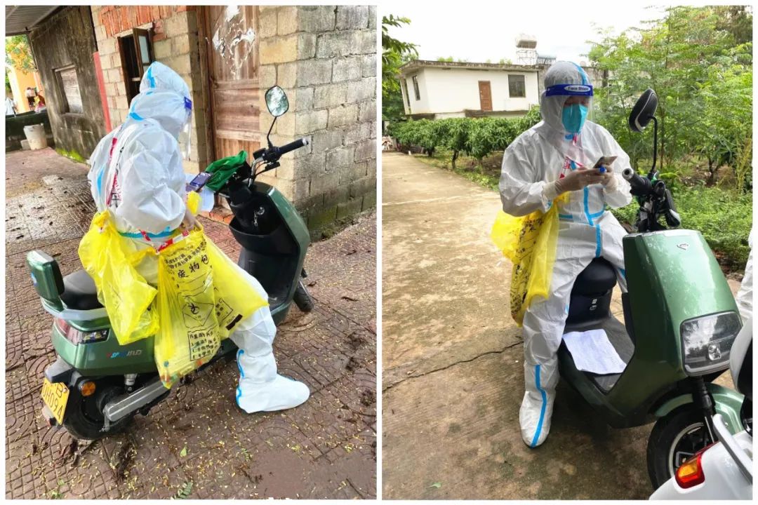 和普通“大白”不一样,流动采样队除了身穿白色的防护服,他们的肩上、腰间还额外披挂着若干自制的各种用途的塑料袋,他们不辞辛劳,马不停蹄,骑着专门配备的“小电驴”走街串巷,风风火火,为村民们及时送去核酸检测服务与暖心的问候,俨然一副为民服务、关爱老弱的“白衣骑士”形象。