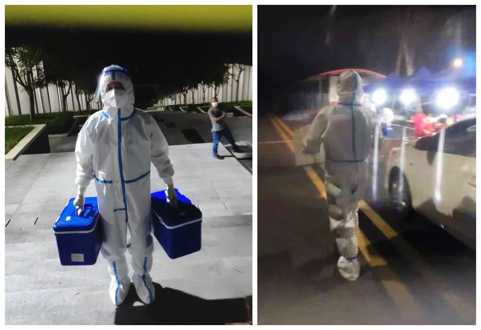 因为与样本零距离接触,他必须身着密不透气的防护服工作,汗水浸透了衣服,皮肤因汗水的浸泡而泛白起皱,防护面罩也在脸上印下了深深的“皱纹”,但他全然不顾身体的不适和疲惫,全然不记得一天滴水未进、粒米未沾,义无反顾、夜以继日地冲在战疫最前线。为了确保检测数据的准确性,所采集的核酸样本必须在2小时内送达至方舱。他一次次全副武装的奔赴,是为了早一分送达检测,少一分传播风险;是为了给全民“战疫”多一份希望,为了给分隔两地的家人道一声珍贵的平安。