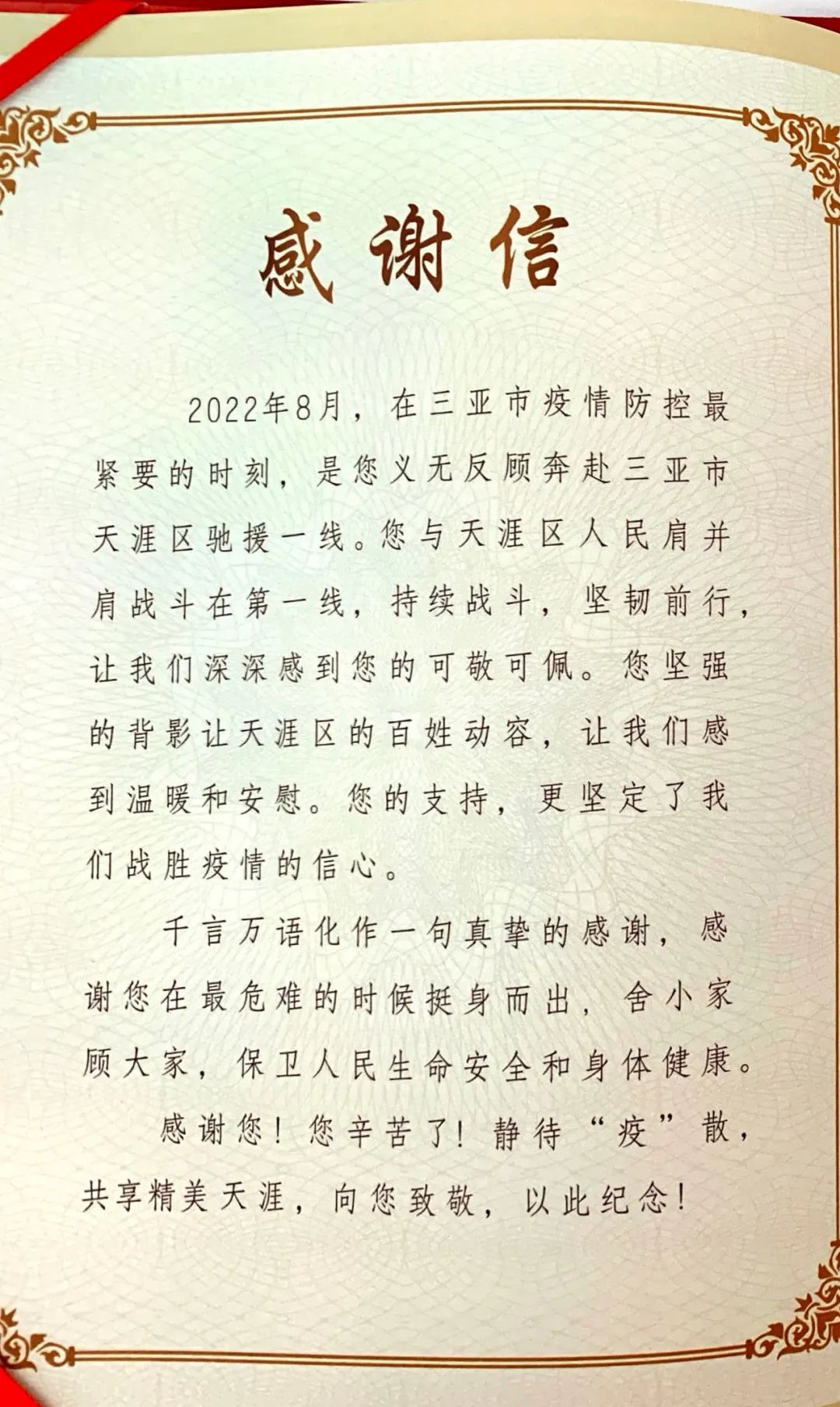 在三亚市天涯区红旗街社区,天涯区副区长麦永学为海南交控30名抗疫志愿者隆重颁发了“无私奉献共抗疫情,鼎力相助共克时艰”荣誉锦旗,并为每名志愿者一一授予荣誉证书,还附一封真挚的感谢信。感谢他们义无反顾奔赴三亚市天涯区驰援一线,与天涯区人民肩并肩战斗在第一线,保卫人民生命安全和身体健康,“您坚强的背影让天涯区的百姓动容,更坚定了我们战胜疫情的信心。”