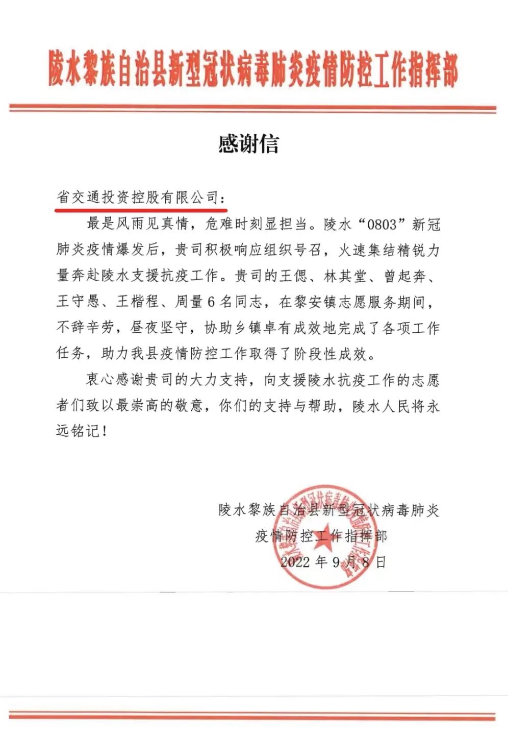 陵水县疫情防控工作指挥部致海南交控志愿者感谢信