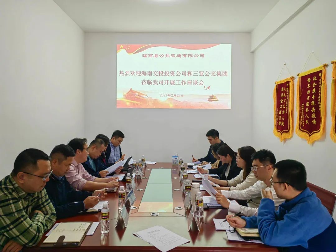 为加强与战略合作方的沟通与交流,积极为临高县公共交通有限公司(简称“临高公交”)未来发展献计献策,2月23日,投资公司执行董事孙琼雅带队赴临高公交与股东三亚市公共交通集团有限公司(简称“三亚公交”)召开现场座谈会。投资公司副总经理陈宇超、财务总监王珊,三亚公交班子成员,临高公交班子成员共同参会。