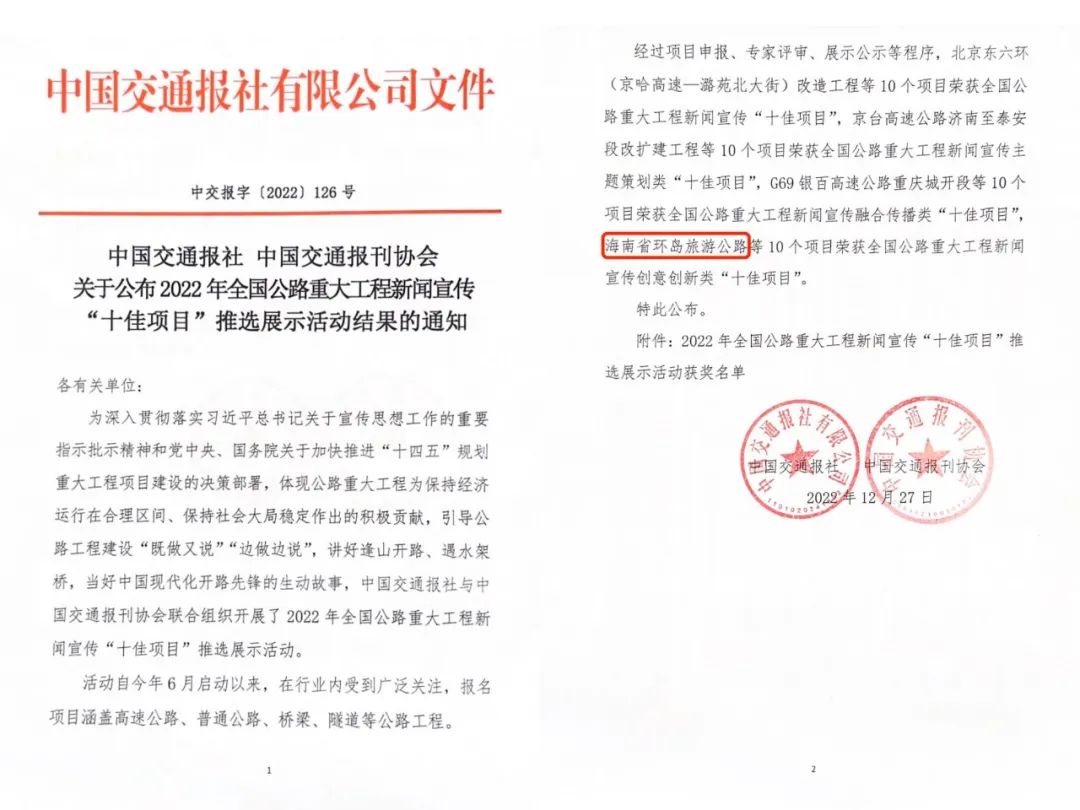 近日,在由中国交通报社、中国交通报刊协会联合主办开展的全国公路重大工程新闻宣传“十佳项目”推选展示活动中,海南交投投资建设、中咨集团等参与施工建设的海南环岛旅游公路项目获评全国公路重大工程新闻宣传创意创新类“十佳项目”。