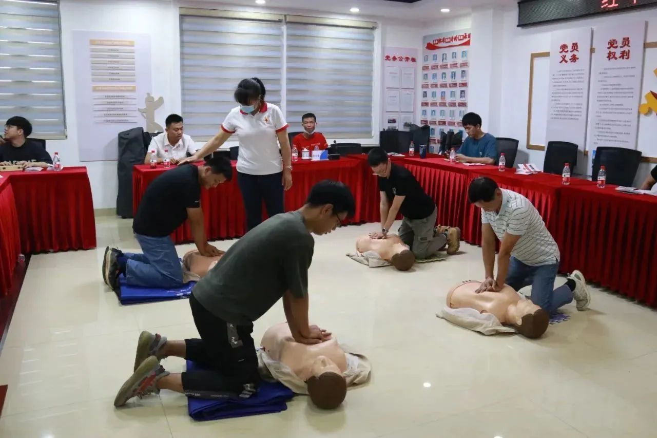 培训的重头戏是应急救护知识实操——心肺复苏术和创伤包扎。心脏复苏实操环节,参训学员认真观摩学习仰头举颏、开放气道、高质量的胸外按压、人工呼吸等心肺复苏技术,培训师们现场对参训学员判断是否丧失意识、有无自主呼吸、胸外心脏按压、清理口腔异物等操作方法逐一进行指导纠正。在创伤包扎实操环节,为更好学习三角巾和绷带的各种包扎技巧,学员们两人一组互相练习,在反复操作中掌握了正确的急救要领。
