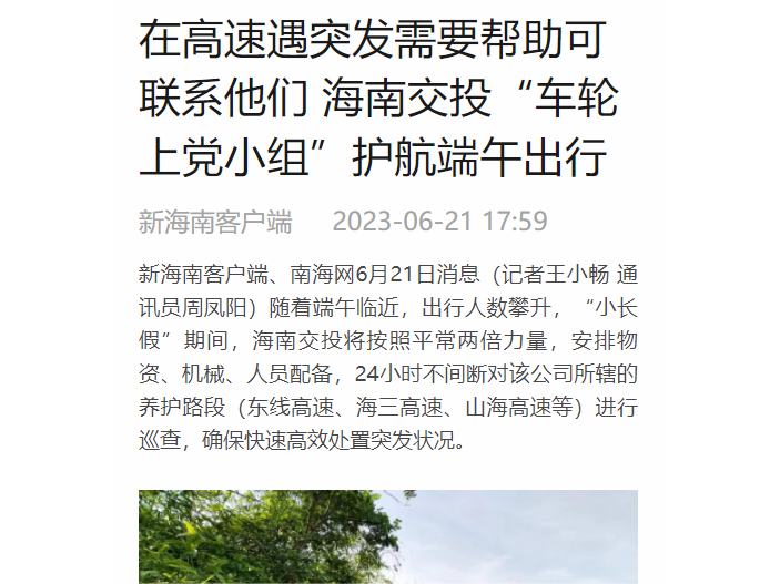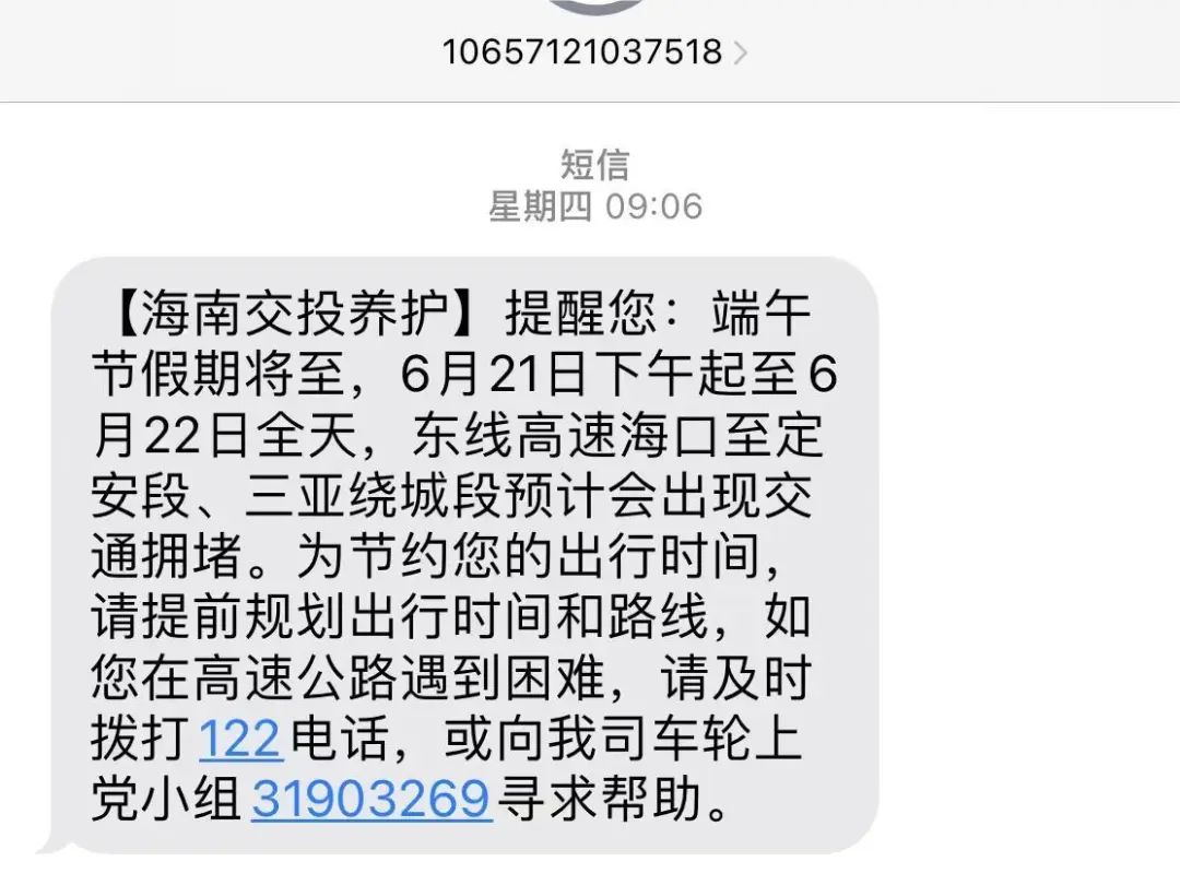 祥和假期,服务有我。为给广大群众带来暖心出行服务,海南交投养护公司通过海南日报APP、新海南融媒体、海南交通广播官微等平台,推送服务联系方式,制作“车轮上党小组‘服务指南’”视频以及发送短信等方式为广大出行司乘进行出行温馨提示,截至目前,图文、视频宣传浏览量近1万次,发送短信218万条。“端午”期间,“车轮上党小组”受理求助并共提供更换轮胎、护送雨天滞留乘客等助民便民服务6次。