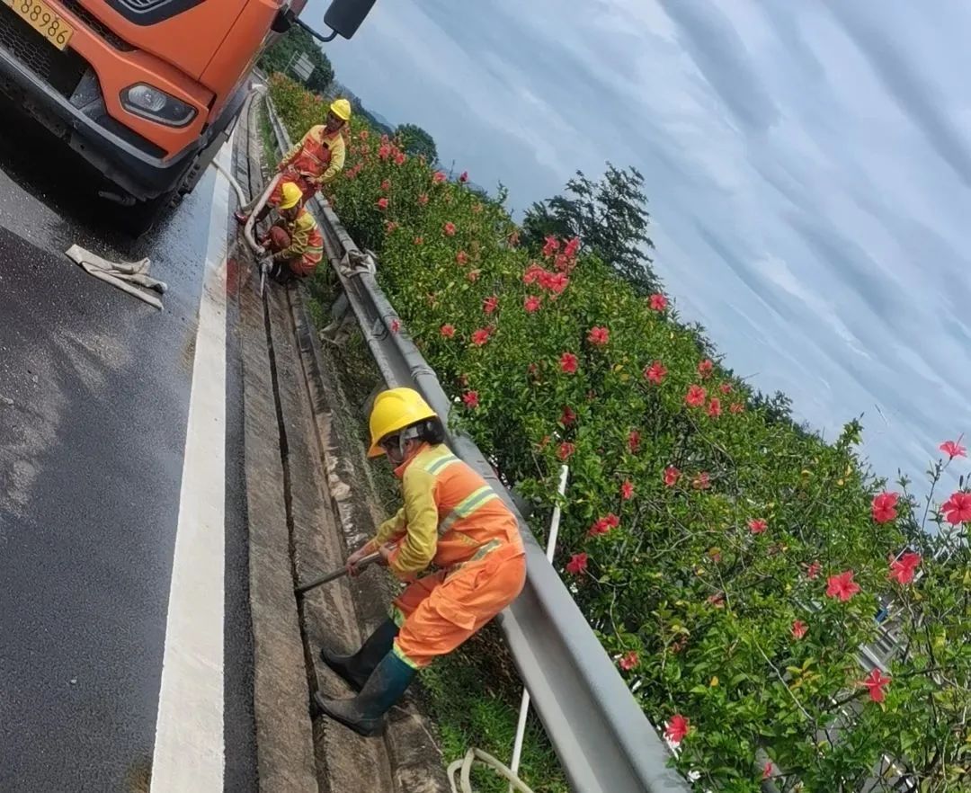 经过系列清淤举措,水车里的水在高压泵的作用下,强有力的从出水口喷射出去,立时便将暗沟内的淤泥杂物冲出,高效地为高速公路畅通了“肠道”,有效缓解了强降雨期间路面积水压力。经过多次工作实践,证实了该方案能大大提高中央分隔带小水沟清淤效率,减少养护工作占道时间,不仅节约了养护成本,还极大提高了安全系数。