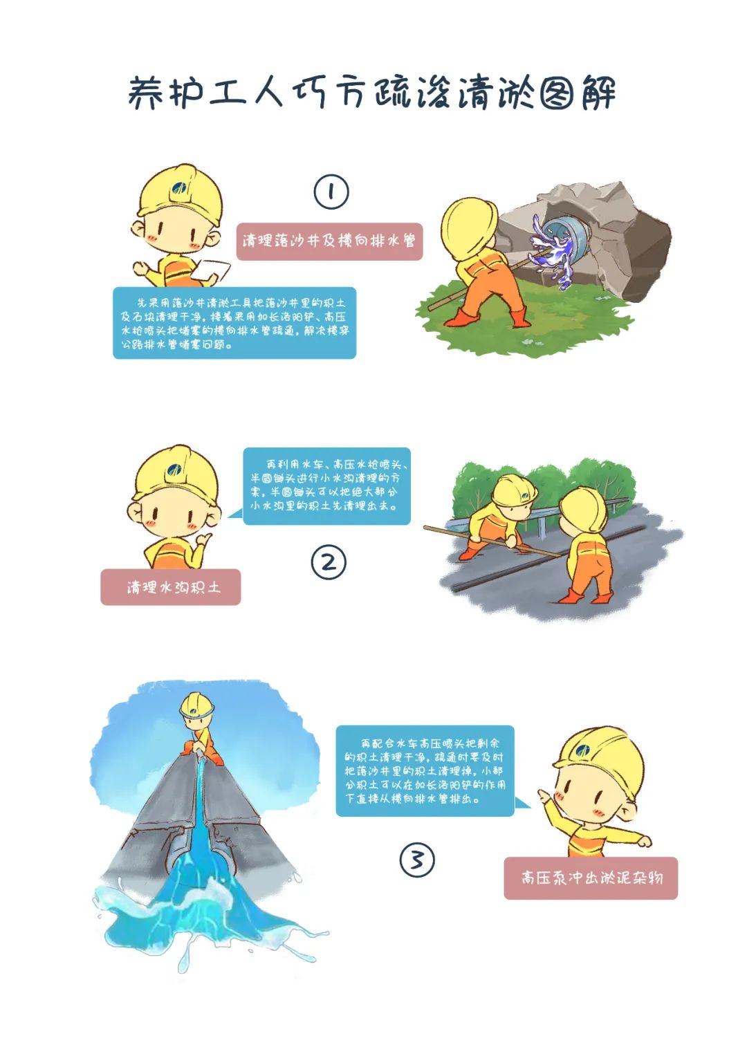 2023年6月,养护公司坡心管理站向公司申报,将“巧方疏浚清淤”项目列入“红色工匠工作室”养护作业管理类金点子专项课题进行探索。考虑到改造小水沟盖板成本过高等现实问题,坡心管理站站长李列,带领副站长、技术员、养护工,反复研究优化养护方案,尽量减少占道时间,在做好安全警示工作的同时,利用水车、加长洛阳铲、高压水枪喷头、特制半圆锄头、落沙池清淤工具进行清淤实验。