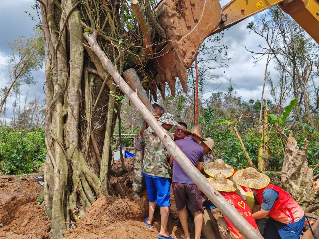 两株古树分别为榕树“子母树”、红佳木,保护等级均为三级,树龄加起来超过300年,却在台风“摩羯”肆虐下完全倾倒,受损严重。海南交投志愿服务队南宝镇中队得知情况后,第一时间会同县林业局工作人员赶赴现场,查看古树受损情况,并结合受损情况紧急制定科学可行的扶正抢救方案,确定了修枝、清障、施药、起重、支撑等各项要素,既保证及时扶正,又保证存活。同时联系海南交投洋浦港高速公司财务总监梁昕,协调洋浦疏港高速公路施工单位中交一公局、龙建路桥公司调配2台大型挖机进场作业。