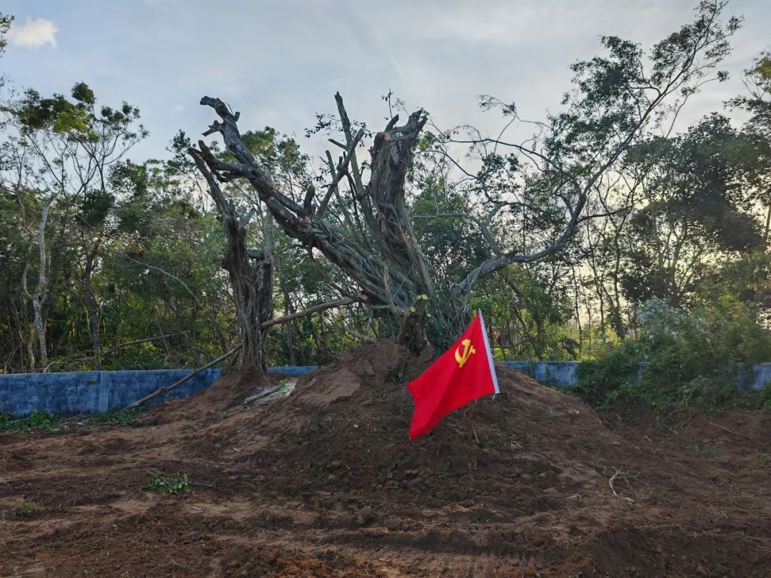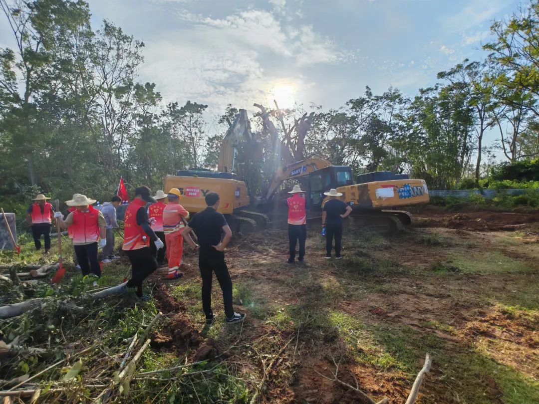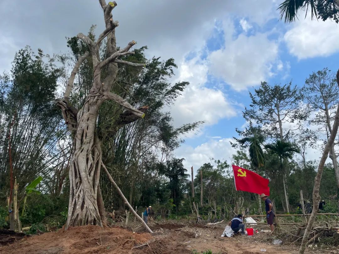 扶正作业现场,中交一公局洋浦疏港高速公路现场副经理龙庆全程指挥,工作人员全神贯注、精准操作,综合考量倒伏情况及原有样貌,2台大型挖机同时发力,一边拉、一边撑、一边填土,每个动作都小心翼翼,力求在不增加损伤的情况下稳稳扶正并夯土固基。经过8小时不间断奋战,这两株饱经风雨的百年古树终于再次傲然屹立于大地之上。