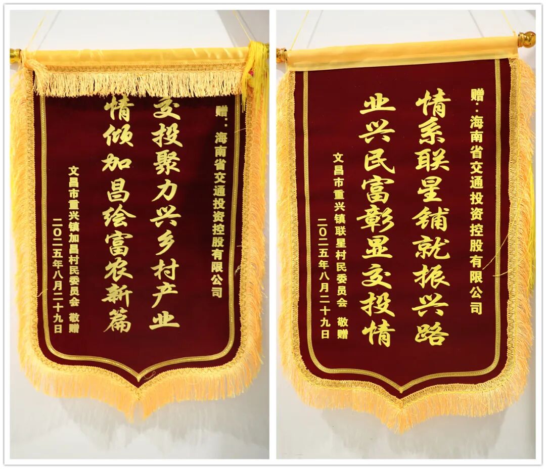 2023年7月至2025年8月,星空app在线登录入口(以下简称“海南交投”)以党建为引领,深入贯彻落实习近平总书记关于“三农”工作的重要论述,全力推进文昌市重兴镇乡村振兴工作,与当地镇委、镇政府共商发展蓝图,累计投入帮扶资金180.2万元,实施产业、民生、基建等项目9个。近日,加昌村委会、联星村委会分别向海南交投赠送锦旗“交投聚力兴乡村产业 倾情加昌绘富农新篇章”“情系联星铺就振兴路 业兴民富彰显交投情”,生动诠释了当地干部群众对交投帮扶工作的高度认可。