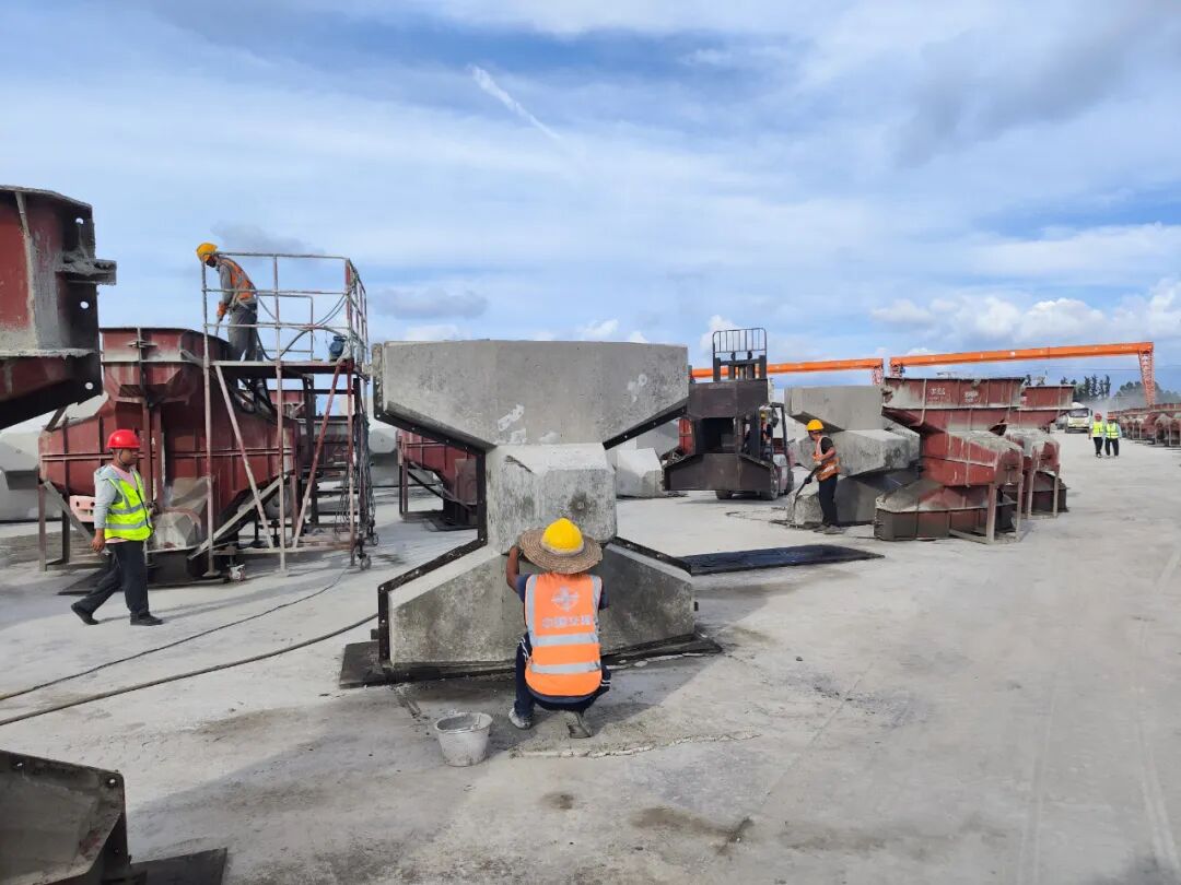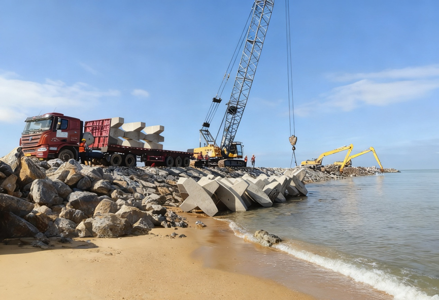 10月6日7时30分,东方市防灾减灾救灾消防安全委员会解除台风Ⅳ级应急响应,港航公司第一时间组织对八所港高排港区一期工程-防波堤项目开展全面安全隐患排查,在确认现场安全条件达标后,迅速推动项目恢复正常施工,全力抢回台风延误工期。走进项目施工现场,“抢时间、保质量、赶进度”的务实氛围扑面而来:扭王字块预制作业高效推进,施工人员严格遵循质量管控标准,有条不紊落实各项施工工序;北防波堤堤身抛填作业规范有序推进,起重机械精准完成石料抛填与扭王字块吊装、安放,为构筑港区稳固的防风防浪屏障奠定基础。