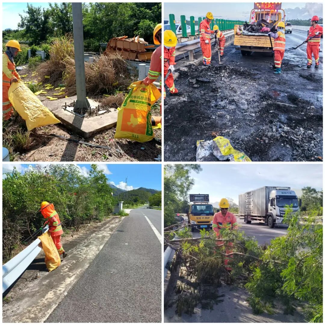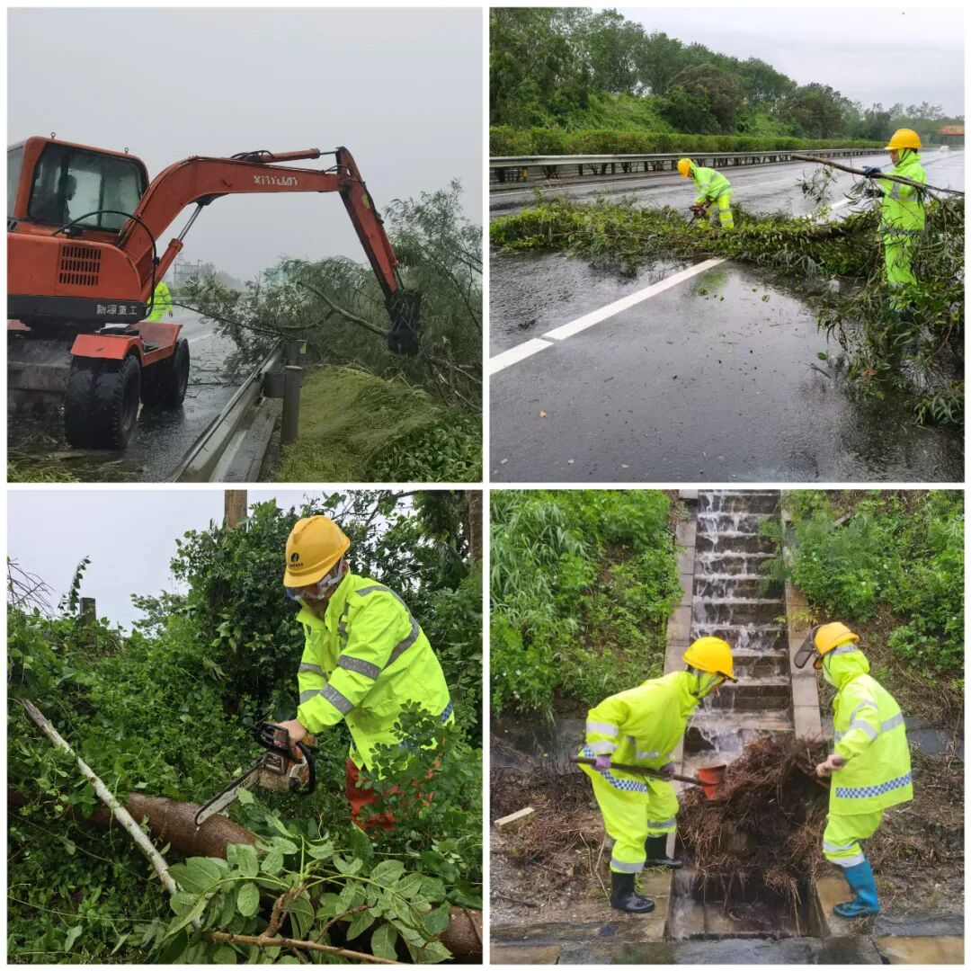 此次台风的强风雨天气导致定安段、永兴段等北部区域大量树木倒伏。应急小组在评估作业天气后,迅速出动,按照“先通后畅、先主后次”原则,对主干线路开展全线巡查和清障作业。现场采取“机械+人工”协同作业模式,大型装载机负责拖移主干、清理堆叠枝干;小型货车快速转运;人工小组配合,用油锯切断大型树支干,清理细枝碎叶、疏通边沟。累计出动545人次,投入设备89台,清理倒伏树木600余株。在高效的抢险模式下,确保了高速公路始终通行顺畅。