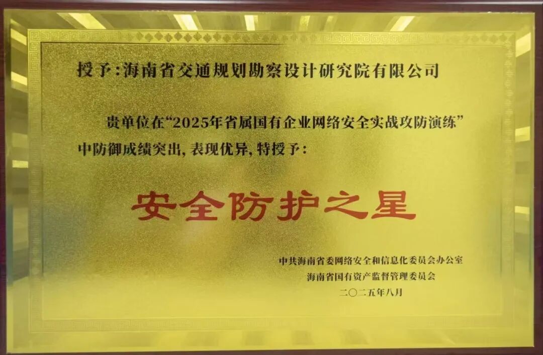 近日,从中共海南省委网络安全和信息化委员会办公室、海南省国有资产监督管理委员会传来喜讯,海南交投及下属单位省交规院、交投项目公司,在2025年省属国有企业网络安全实战攻防演练活动中,凭借出色的安全防护能力、快速的应急响应机制和卓越的团队协作精神,分别获评“应急处置优秀单位”“安全防护之星”荣誉称号。