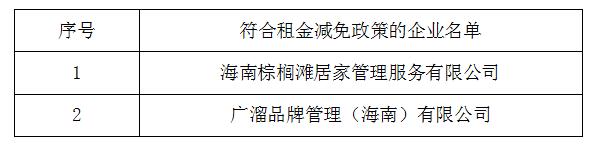 根据《中共海南省国有资产监督管理委员会委员会关于认真贯彻落实省政府应对新型冠状病毒肺炎疫情相关措施的通知》(琼国资党〔2020〕6号)以及《关于进一步明确省属国有资产类经营用房减免中小企业旅游企业房租租金有关工作的通知》(琼国资财〔2020〕22号)文件精神,为切实帮助我省中小企业在防控新冠疫情期间减本降负、渡过难关,在我司内部认真审核的基础上,现拟对符合租金减免政策的企业名单予以公告,欢迎社会各界监督。公示时间:2020年5月8日-5月13日(5个工作日),监督电话:18976203336。