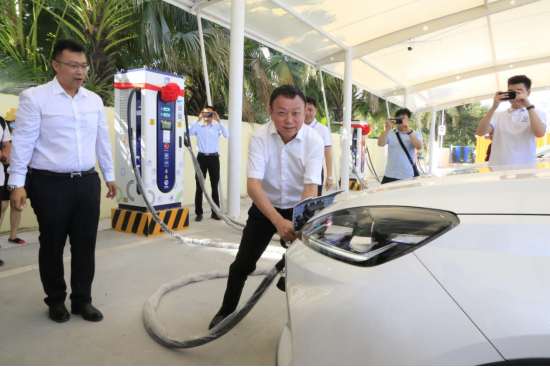 海南交通控股党委书记、董事长开启三亚海坡充换电站车辆首充仪式。
