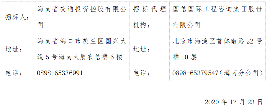 海南省环岛旅游公路工程股权投资+施工总承包招标于2020年12月16日在海南省公共资源交易服务中心进行了公开招标,2020年12月18日发布中标候选人公示,公示截止日期为2020年12月21日,在公示期内未收到书面的质疑。现将中标结果公示如下: