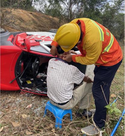 生命至上,紧急救援!两人急忙带上急救药箱下车查看,发现司机头部受伤流血,所幸伤势并不严重。唐惠滨细心为伤员清理包扎伤口,并将伤员扶至阴凉处休息。陈德聪帮忙将车辆开至安全路面。之后,两人详细询问伤员身体情况,并在确认无需拨打急救电话后,将其送回家。